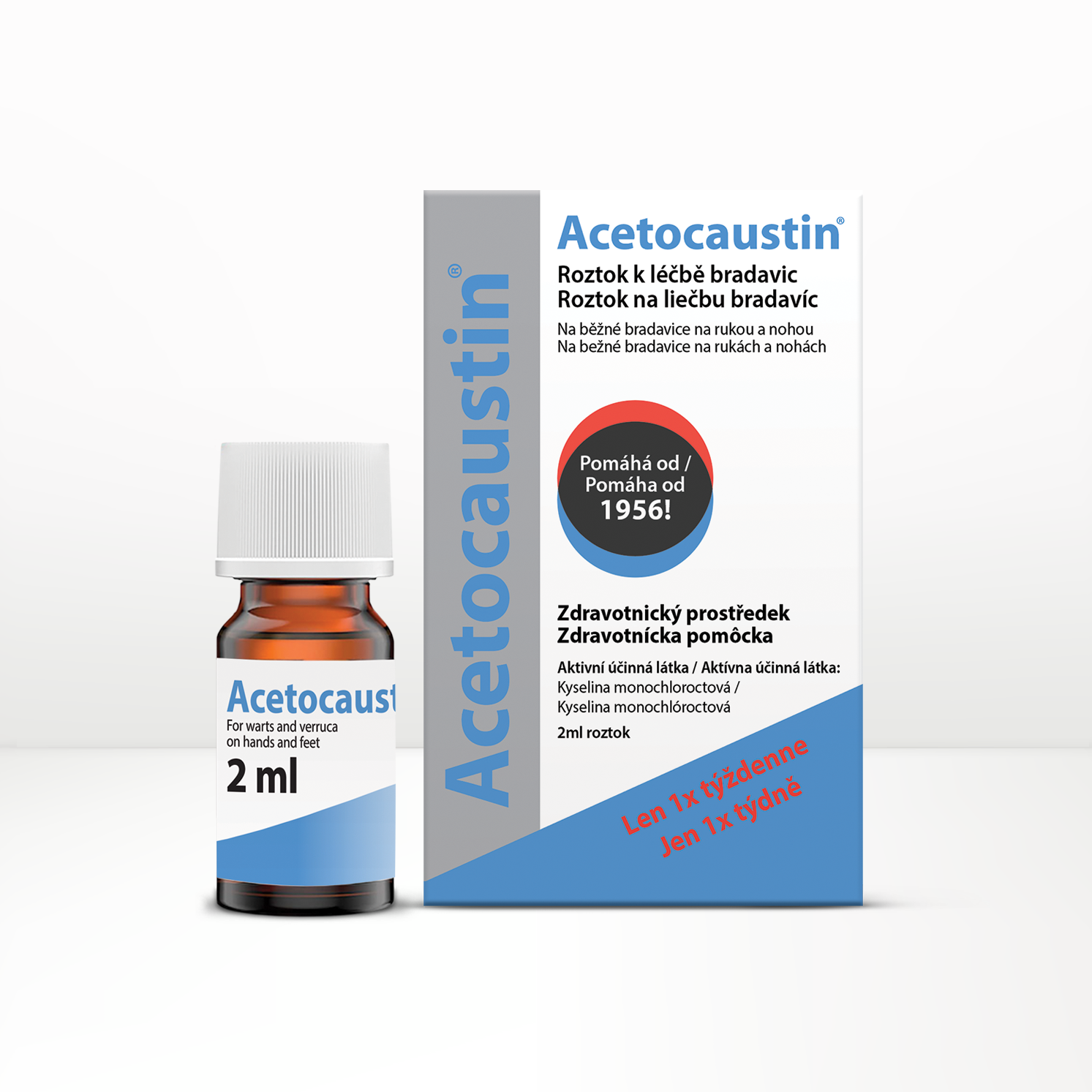 Acetocaustin Acid Wart Treatment poskytuje snadno použitelnou léčbu bradavic a veruk. Obsahuje účinnou látku monochloroctovou kyselinu (MCA), což je silná organická kyselina, která má rozkladný účinek na kůži a představuje účinnou alternativu k našemu zmrazovacímu ošetření bradavic.